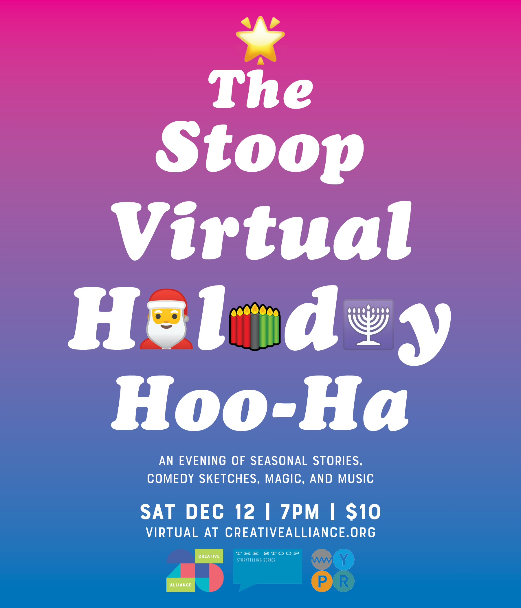 The Stoop Storytelling Series in partnership with WYPR presents “The Stoop Virtual Holiday Hoo-Ha: An evening of seasonal stories, comedy sketches, music, and MAGIC” on Saturday, December 12.